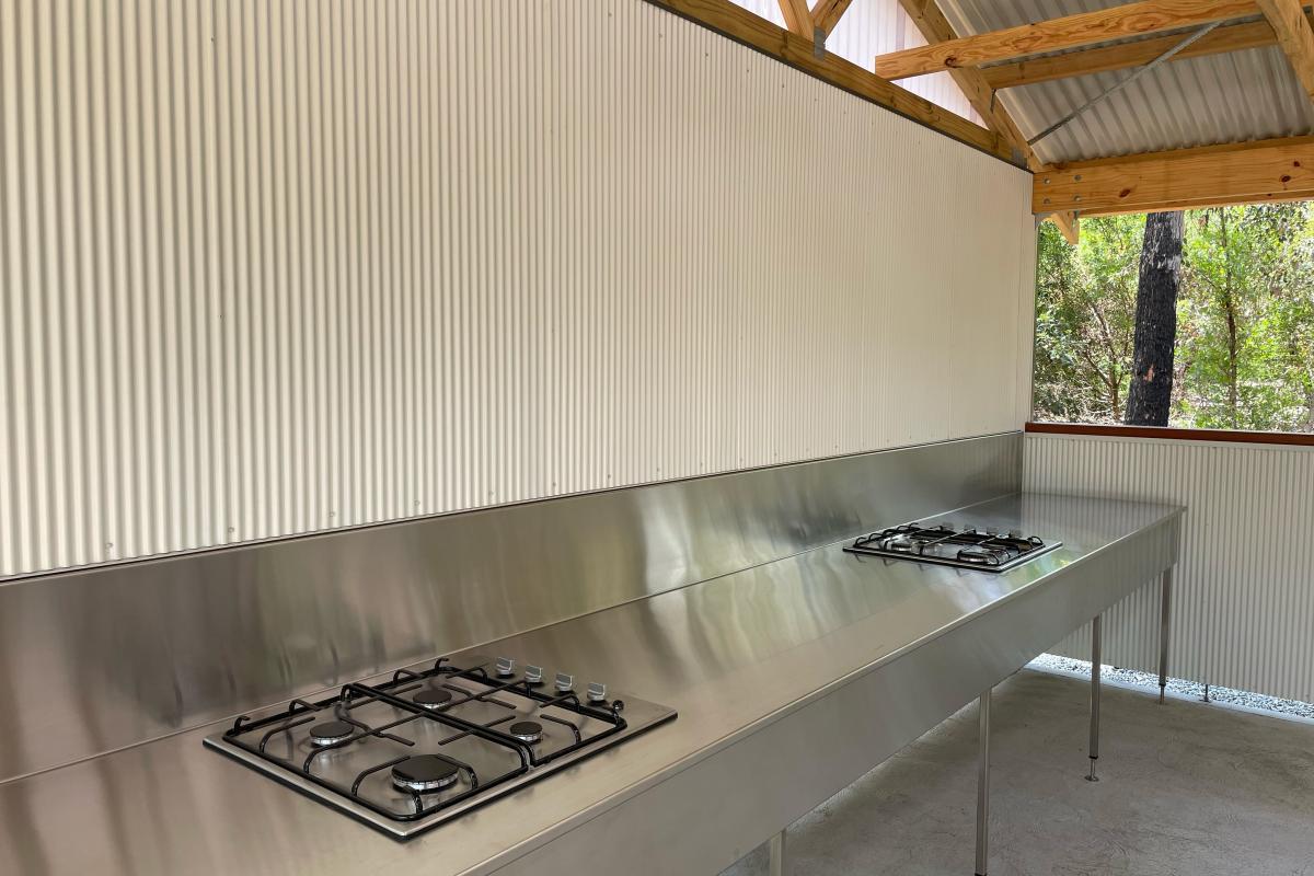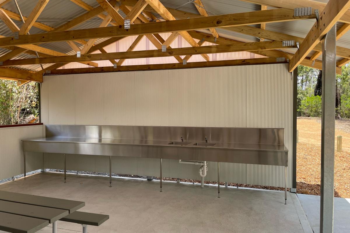 Food preparation and dining shelter with a gas stove, dishwashing sink, food preparation surfaces, picnic tables and benches.